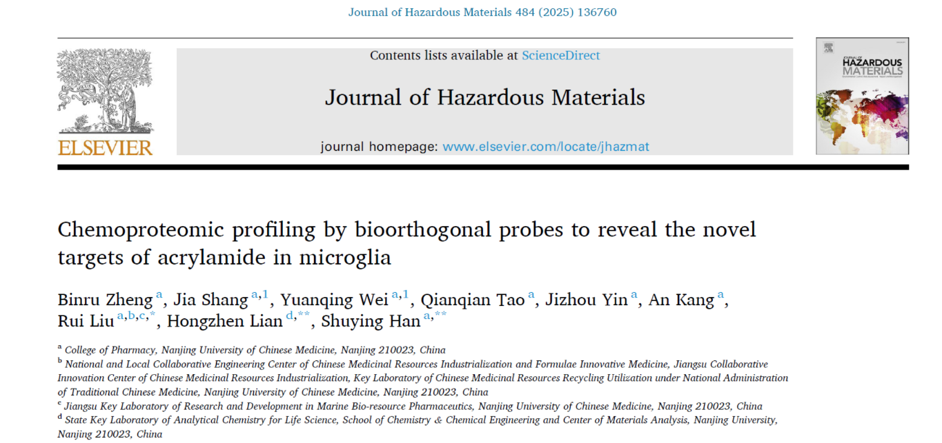 beat365在线唯一官网药学院韩疏影副教授、刘睿教授团队联合南京大学练鸿振教授在知名学术期刊Journal of Hazardous Materials(中科院一区,IF: 12.2)在线发表题为“Chemoproteomic profiling by bioorthogonal probes to reveal the novel targets of acrylamide in microglia”的最新研究成果。