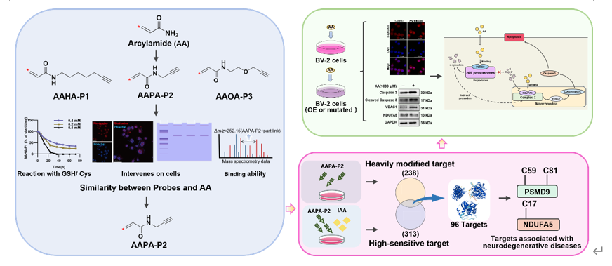 近年来,暴露于丙烯酰胺(AA)引起的神经毒性研究受到广泛关注,但因对AA靶蛋白了解有限,其神经毒性作用机制尚未阐明。本研究设计并合成了一种结构类似于AA的生物正交探针,结合化学蛋白组学技术,在小鼠小胶质细胞(BV-2)中捕获并鉴定了754个AA共价修饰的蛋白,并对进一步筛选出的潜在关键靶点和结合位点进行了验证。研究发现,AA可通过与PSMD9蛋白上Cys59与NDUFA5蛋白上Cys17共价结合,串扰泛素-蛋白酶体系统与线粒体呼吸链,从而诱发神经元凋亡。本研究为确定丙烯酰胺的共价结合靶标提供了一种有效的生物正交探针工具,并为了解丙烯酰胺诱导神经毒性的分子机制及中药干预治疗AA相关神经损伤的潜在治疗靶点提供了新的视角。