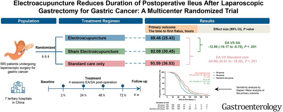 近日,beat365在线唯一官网孙建华教授团队在国际胃肠肝病学期刊Gastroenterology(中科院一区top,影响因子26.3)发表论文《电针可缩短胃癌腹腔镜胃癌术后肠麻痹时间的多中心随机试验(Electroacupuncture Reduces Duration of Postoperative Ileus After Laparoscopic Gastrectomy for Gastric Cancer: A Multicenter Randomized Trial)》。论文链接:https://www.sciencedirect.com/science/article/pii/S0016508525003737