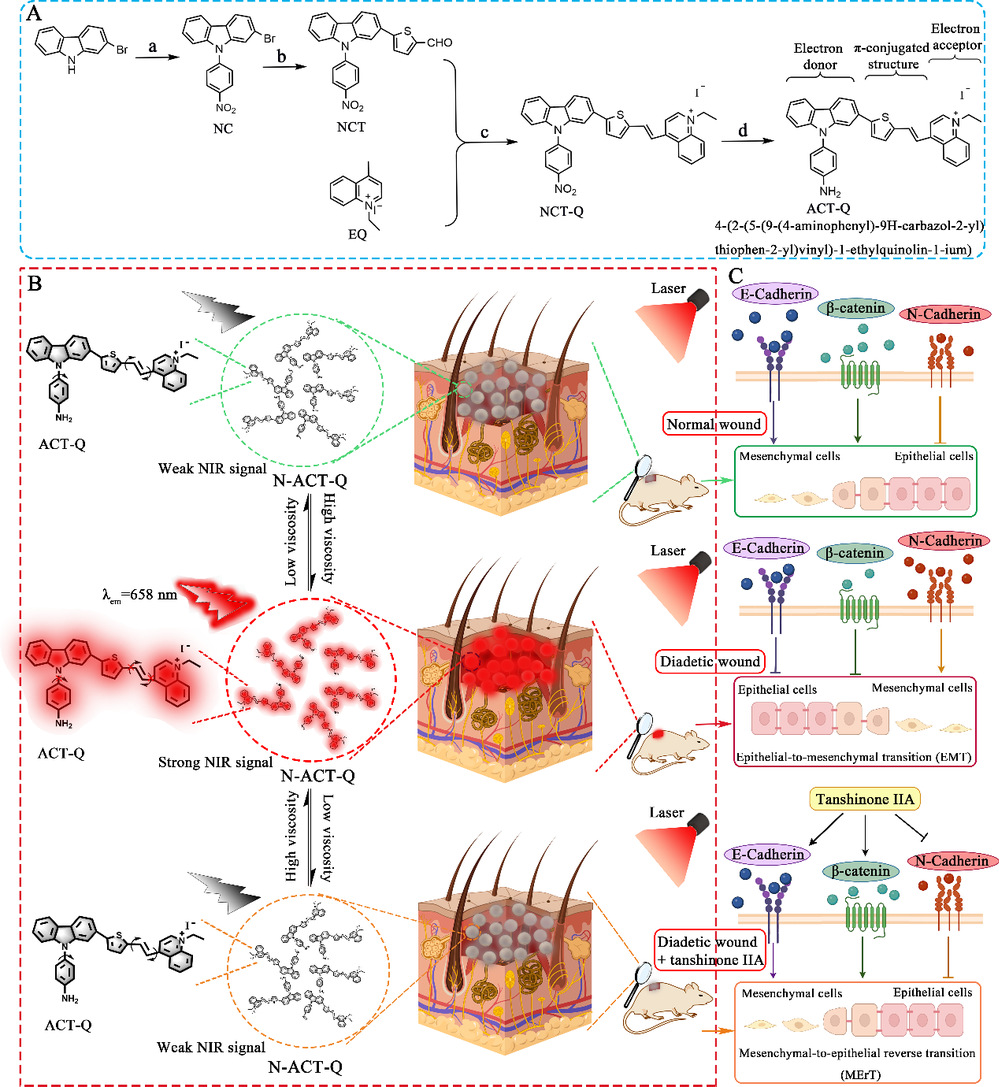 近日,beat365朱栋教授课题组在国际知名期刊Chemical Engineering Journal(中科院一区,IF:13.4)发表题为“Viscosity-activated reversible fluorescent probe for monitoring the diabetic refractory wound microenvironment”的研究性论文,为“血瘀”高粘度微环境定量监测提供新策略。
