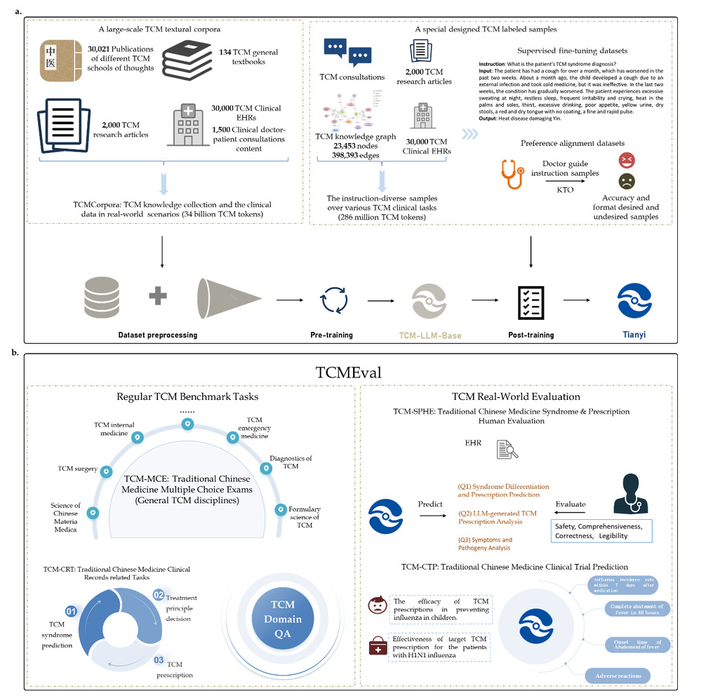 大语言模型(LLM)的发展显著提升了人工智能的拟人化水平和综合性能,并在多个领域展现出强大能力。然而,在专业知识体系复杂的中医领域,通用大模型及现有中医大模型仍面临专业知识匮乏、幻觉现象突出、部署成本较高等挑战。针对这些难题,研究团队基于中医任务特点,在平衡性能与部署成本的前提下,开发了参数量为76亿的中医大语言模型——天医。该模型整合了上百册国家规划教材、3万部中医经典与名医专著、2000余篇学术论文、3万例脱敏临床病历,并纳入2万条结构化知识图谱,总计涵盖34亿个高质量中医语义单元。通过多阶段训练策略,天医实现了对中医知识体系的深度理解。进一步,团队以中医通用问答、证候诊断、治法决策和处方生成为核心任务,通过指令微调与KTO强化学习,确保模型输出严格遵循中医临床辨证论治逻辑。