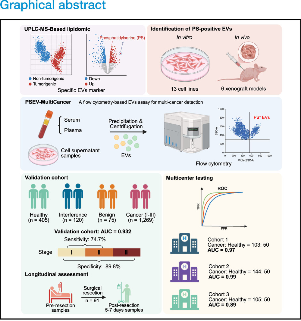 本研究率先通过脂质组学分析鉴定磷脂酰丝氨酸(phosphatidylserine, PS)为肿瘤特异性EVs标志物。接着通过对13种细胞系及6种小鼠模型的研究证实,PS阳性EVs(PS⁺EVs)与肿瘤负荷及细胞凋亡进程显著相关。基于此,团队开发了基于流式单囊泡检测方法的新型血液检测技术 PSEV-MultiCancer,通过量化PS⁺EVs实现了12种高发癌种(涵盖乳腺癌、肺癌、胃癌、肝癌、结直肠癌、胰腺癌、食管癌、卵巢癌、膀胱癌、鼻咽癌、甲状腺癌和肾癌)的同步筛查。在包含1269名癌症患者(I-III期)及600名阴性对照(含405名健康对照、120名干扰患者及75名良性肿瘤患者)的队列中,PSEV-MultiCancer展现出卓越诊断效能(AUC=0.932),总体灵敏度达84.7%,特异性为89.8%,尤其对早期(I-Ⅱ期)癌症的检测灵敏度为74.7%。此外,在三个独立中心的盲法验证中,该技术均保持高诊断准确性(AUC最高达0.99)。该研究为通过液态活检实现泛癌种早筛开辟了新路径,将有力推动临床可切除肿瘤的早期诊断。