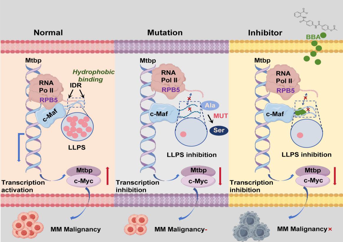 2025年11月12日,beat365在线唯一官网杨烨/顾春艳教授课题组在MedComm期刊(中科院一区/JCRQ1,IF:10.7)在线发表题为“Targeting the Liquid–Liquid Separation Region of c-Maf for Treating Chromosomal Translocations in Multiple Myeloma”的研究论文。多发性骨髓瘤(MM)是一种难以治愈的血液肿瘤,转录因子c-Maf不仅频繁参与MM相关的染色体易位,其自身亦具备发生液-液相分离(LLPS)的能力。尽管c-Maf因其转录因子特性长期被视为“不可成药”靶点,本研究提出干预其LLPS过程作为治疗新策略。通过系统的体内外实验证实,c-Maf可经由LLPS形成生物凝聚体,进而促进肿瘤进展。在机制层面,c-Maf的固有无序区(IDR)驱动相分离,并招募RNA聚合酶II,激活Mtbp/c-Myc信号通路。研究发现苯甲酰苯甲酸(BBA)可靶向结合c-Maf的IDR,破坏其LLPS过程,从而阻断RNA Pol II募集及Mtbp/c-Myc信号激活,有效抑制MM进展。该研究不仅揭示了c-Maf通过LLPS机制激活c-Maf/RNA Pol II/Mtbp/c-Myc信号轴推动肿瘤发生,同时验证了靶向相分离策略在治疗染色体易位相关MM中的潜在应用价值。