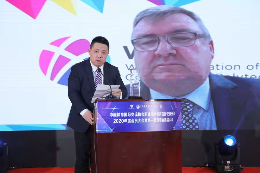 世界职业院校与技术大学联盟副主席、中国教育国际交流协会副秘书长沈雪松向我院颁奖