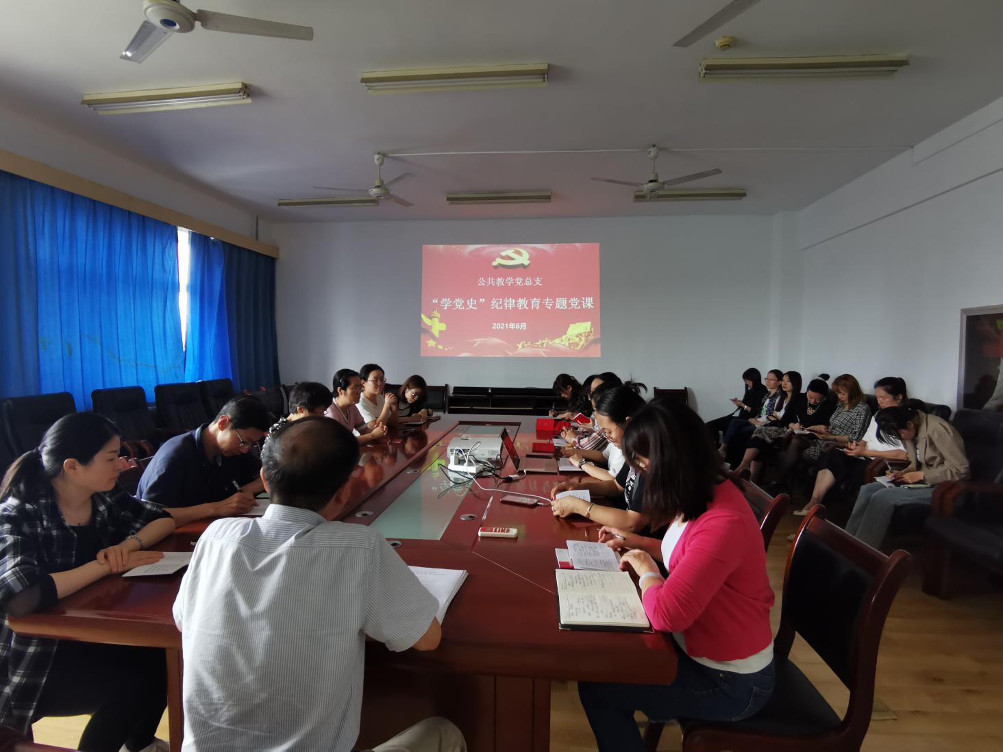 在庆祝建党100周年,开展党史学习教育及第四个纪律教育学习宣传月活动的关键时期,6月18日下午,公共教学党总支书记南欢同志以红色经典歌曲“《三大纪律八项注意》的诞生和发展”为题,在崇文南楼711为公共教学党总支第一、第二支部全体党员,上了一堂“学党史”纪律教育专题党课。