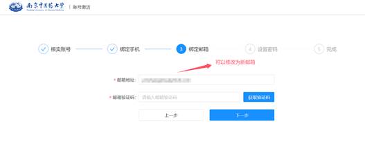 (4)进入绑定邮箱页面,若须当前显示的邮箱,则在邮箱输入框输入新的邮箱,用新的邮箱接收验证码,点击获取验证码(此步需要到邮箱中收取验证码),输入邮件验证码后点击“下一步”。