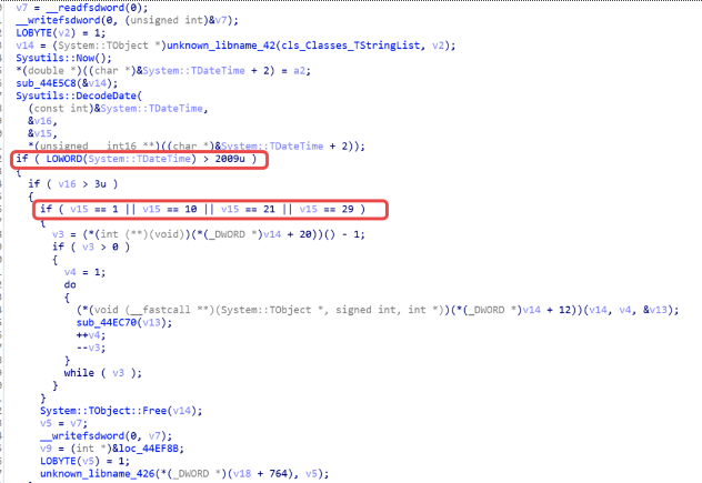 这个暴力删除操作,样本是会判断时间的,原先设定为大于2009年的大于3月的每个月的1号、10号、21号、29号进行,而这里由于蠕虫病毒代码编写出现了一点的问题,导致判断时间出现了偏差,导致原先应该早就爆发的暴力删除操作,推迟到今天才执行。
